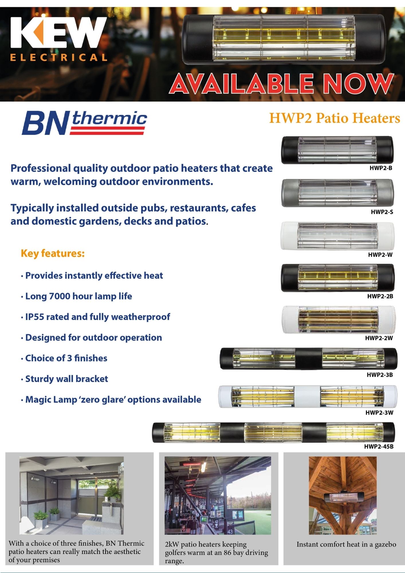 We have a large range of patio heaters in stock across KEW branches, including BN Thermic’s HWP2 heaters, Pew heaters and Vent Axia’s instant outdoor heater. Call us or pop in for competitive pricing and a knowledgeable friendly service.