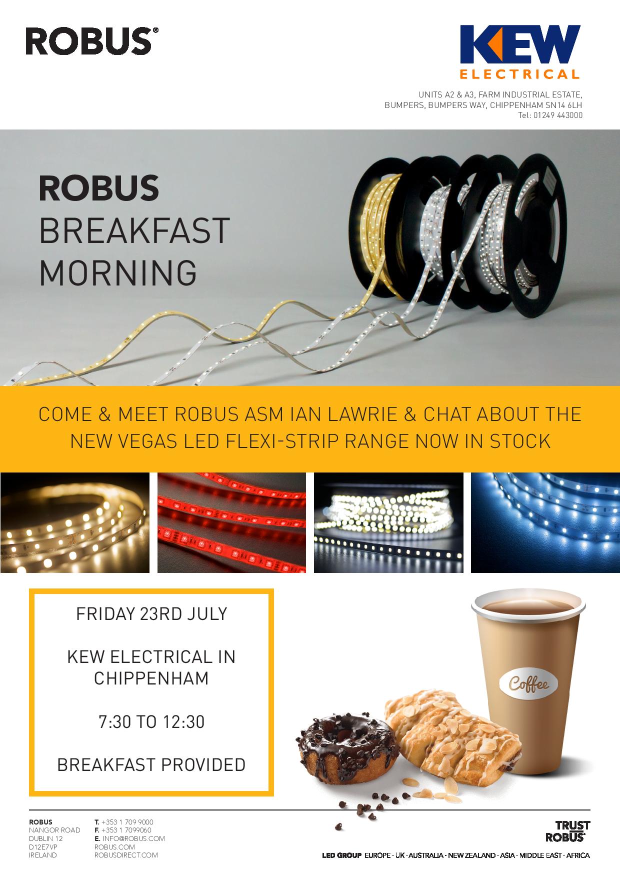 Meet Ian Lawrie from Robus Lighting and talk in person about the brilliant Vegas LED flexi-strip range, stocked here at KEW. Join the team for a breakfast morning on 23 July and find out how this range can help with that next install or project. Find KEW Chippenham.